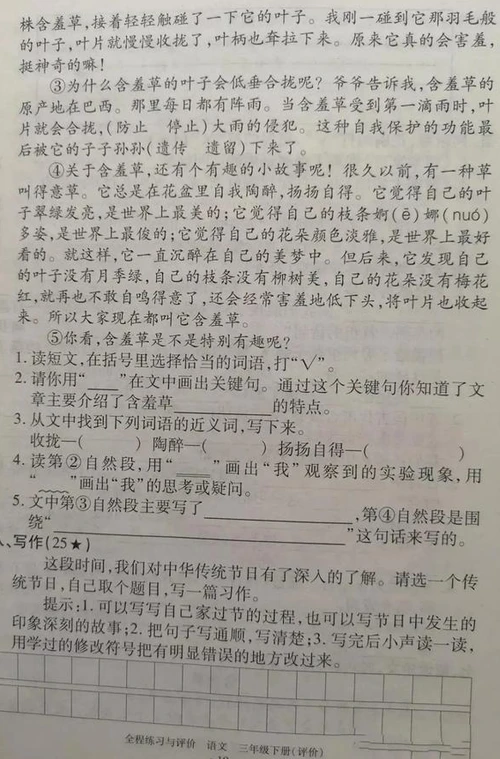 ②要求用横线画短文中的关键词,仔细地看完短文后,就会发现整篇短文是围绕着含羞草是否会害羞来展开写的,很自然的就发现文中的关键词是第二自然段的第一句话,含羞草真的会害羞吗?