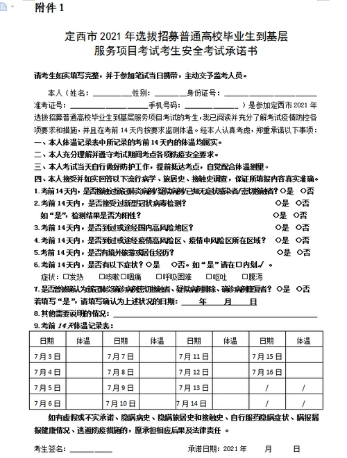 1.考生应于考前14天在微信搜索“健康新甘肃”小程序,申领“甘肃省健康出行码”,随时关注“健康码”状态,并下载打印《承诺书》,做好备考期间个人日常防护和自主健康监测,按要求如实、完整填写《承诺书》相关信息和健康数据并确认签字(同时参加上午和下午笔试的考生,请将《承诺书》填写完整签字后复印一份,在上午和下午进入考场时主动交予监考人员)。