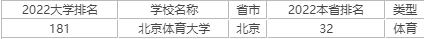 北京体育大学2022年在全国本科院校排名第181位,本省大学排名第32位。