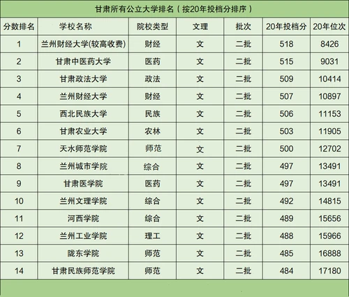 按照投档分数线的高低排序,本文将所有位于甘肃省内且在本科二批次招文科生的大学展示在如下这份榜单中,供同学们参考: