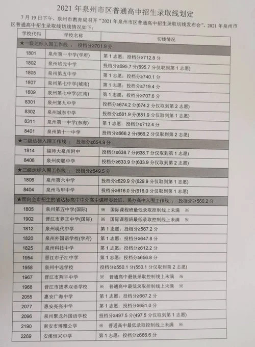 2021年市区普通高中招生录取切线会举行,现场公布了切线结果。泉州市普通高中最低录取控制线为458分,泉州市省级达标高中(国际课程班)最低录取控制线为599分。