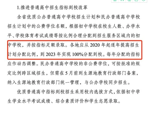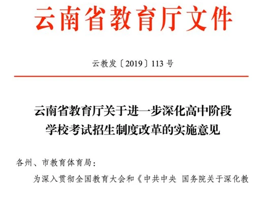 2019年12月,云南省教育厅印发《关于进一步深化高中阶段学校考试招生制度改革的实施意见》,其中提到,“各地应从2020年起逐步提高招生计划分配比例,到2023年实现100%分配到校。”