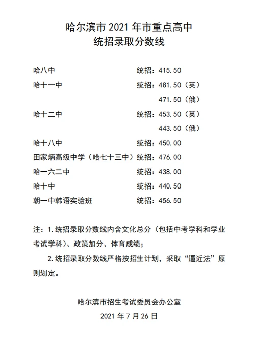 黑龙江哈尔滨重点高中2021年中考分数线