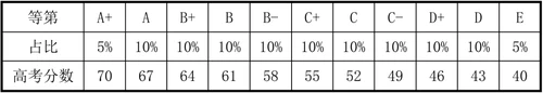 等第折算规则为:考试成绩由高到低分为A+、A、B+、B、B-、C+、C、C-、D+、D、E共5等11级。其中A+约占5%,A、B+、B、B-、C+、C、C-、D+各约占10%,D、E共约占15%。A+折算为70分、A为67分、B+为64分、B为61分、B-为58分、C+为55分、C为52分、C-为49分、D+为46分、D为43分、E为40分,每档相差3分。