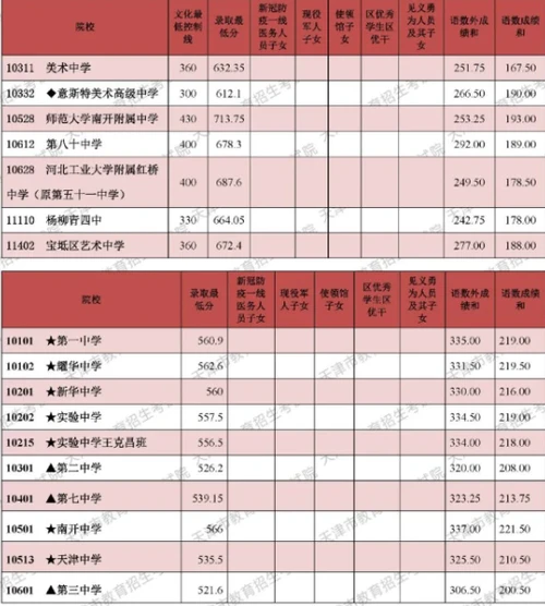 2021年普通高中学校招生工作正在进行中。截止到7月19日,7所艺术类高中学校以及南开中学、天津一中、耀华中学、新华中学、实验中学、天津二中、天津三中、天津七中、天津中学9所市重点高中学校和实验中学王克昌班的录取工作已经结束。7所艺术类高中学校共录取新生710人,9所市重点高中学校和实验中学王克昌班共录取新生4373人,各招生学校录取最低分附后。