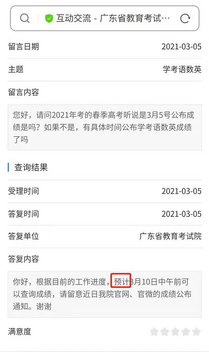 2021年3月5日,广东省教育考试院回复:“预计3月10日中午前可以查询成绩”。