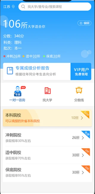 APP里面有每个大学往年的录取分数、录取人数、录取要求,全部都做好了分类整理。学生只需要输入自己的分数,APP就能给你推荐合适的院校。