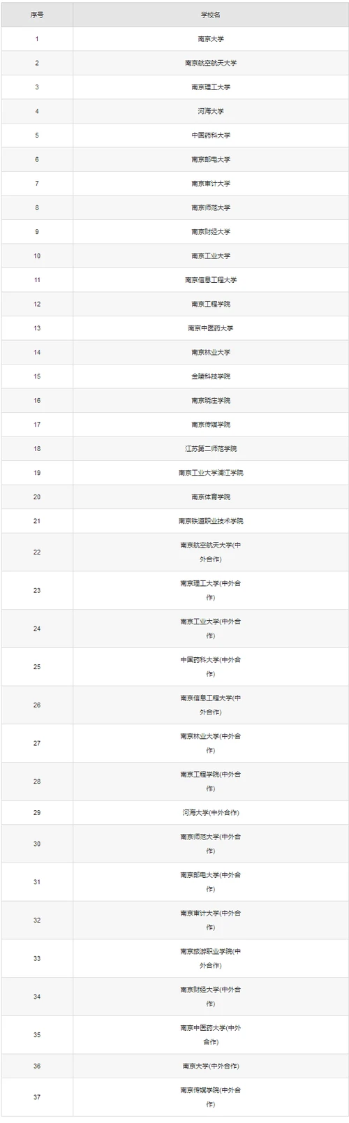 位于南京市的普通中外合作大学中,历史类分数线排名前3的大学分别是南京大学、南京师范大学、南京航空航天大学。历史类分数线最靠后的3所大学分别是南京工业大学浦江学院、南京铁道职业技术学院、南京传媒学院,对应的分数线是478-496、位次是42608-50966,这意味着:2025年南京历史类考生,最低42608位,就有机会读南京中外合作大学。