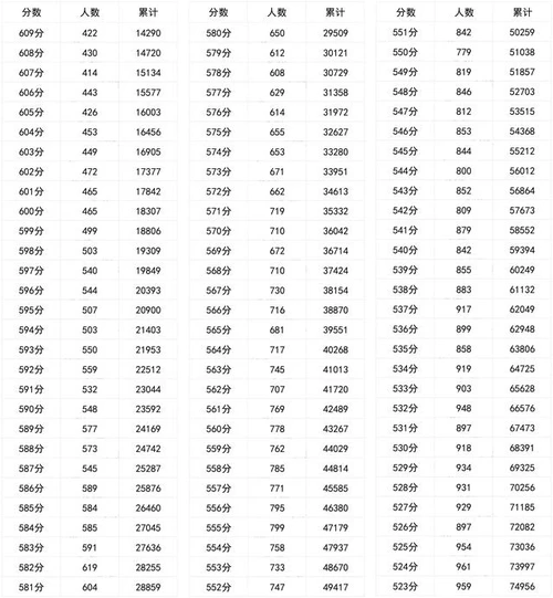 四川一分一段表2022理科 2022四川一分一段表最新,四川省目前高考成绩、本科线已经公布,考试院在23日晚也公布了分段表情况,下面是四川省2022年理科成绩分段统计表情况,其中600分以上人数共计18307人: