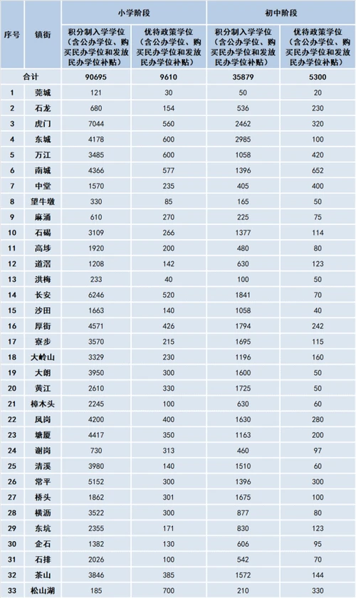 东莞市2021年非户籍适龄儿童少年,积分制入学和优待政策学位供给情况一览表