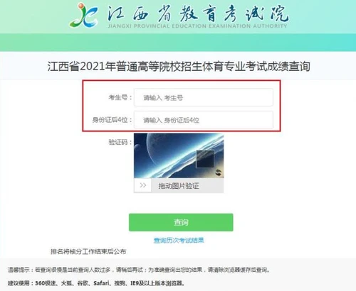 2.登录“江西省教育考试院()”→“江西省2021年普通高等院校招生体育专业考试成绩查询入口”,考生输入考生号、身份证号(后四位)进行查询。