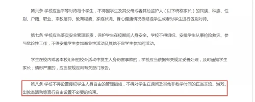 第八条 学校不得设置侵犯学生人身自由的管理措施,不得对学生在课间及其他非教学时间的正当交流、游戏、出教室活动等言行自由设置不必要的约束。