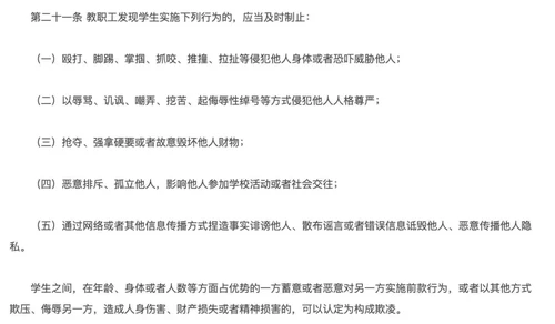 ● 《未成年人学校保护规定》明确了欺凌的概念,要求学校应当定期针对全体学生开展防治欺凌专项调查,对学校是否存在欺凌等情形进行评估,并归纳了侵犯身体、侮辱人格、侵犯财产、恶意排斥、网络诽谤或传播隐私等以下五类欺凌行为: