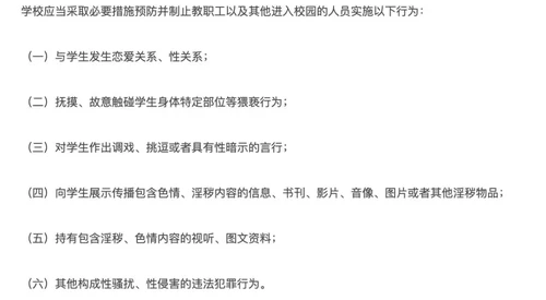 《规定》中第三章第二十四条规定: 学校应当建立健全教职工与学生交往行为准则、学生宿舍安全管理规定、视频监控管理规定等制度,建立预防、报告、处置性侵害、性骚扰工作机制。