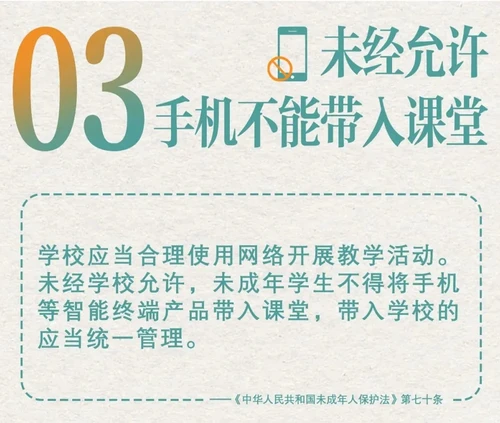 ●《未成年人学校保护规定》与“五项管理”的要求也逐项进行了衔接。其中规定学校对手机管理的权限,明确规定除教学需要外,禁止手机等智能终端产品进课堂。