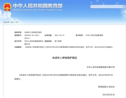●6月1日,教育部举办新闻发布会,时任教育部部长陈宝生签发了第50号教育部令,颁布《未成年人学校保护规定》(以下简称《规定》)。