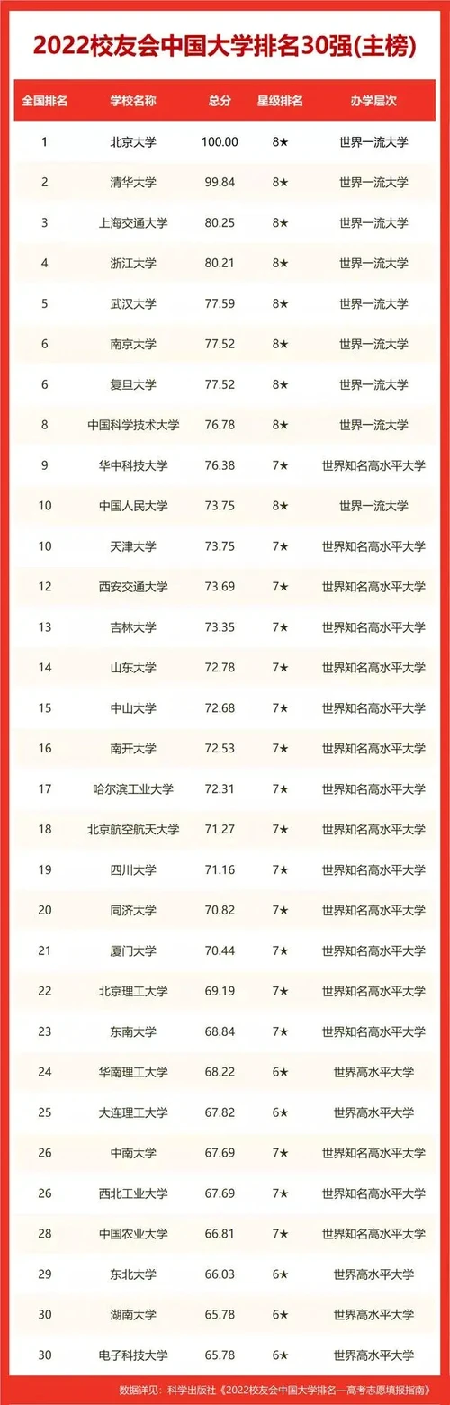 在最新2022中国大学星级排名中,北京大学、清华大学、上海交通大学、浙江大学、武汉大学、南京大学、复旦大学、中国科学技术大学、中国人民大学、中国科学院大学和国防科技大学等11所高校荣膺2022中国八星级大学(8★)美誉,整体水平已达到世界一流大学水平,晋升世界一流大学前列是这些高校未来的重点发展目标。