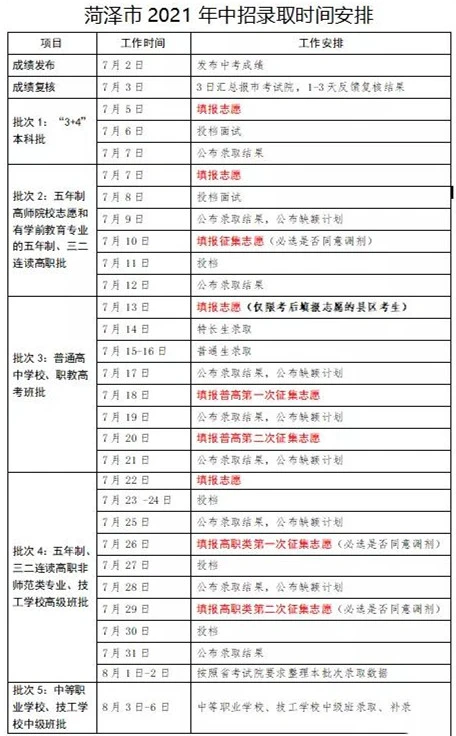2021菏泽中考录取批次时间表