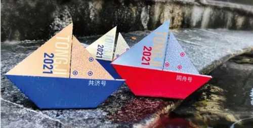 打开通知书后,在欢迎信的后面,还藏了一份 " 造船指南 ":根据 " 造船指南 ",把 3 张折纸按压痕叠成 " 同舟号 "" 共济号 " 和 " 梦想号 ",托起梦想的风帆。
