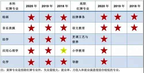 注:红牌专业指的是失业量较大,就业率、薪资和就业满意度综合较低的专业。这与相关专业毕业生供需矛盾有关。红绿牌专业反映的是全国总体情况,各省区、各高校情况可能会有差别。