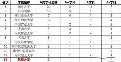 在全国地四轮学科评估中,苏州大学只有2个学科获评“A-”,所拥有的A类学科数排在江苏省高校第13名。详情如下: