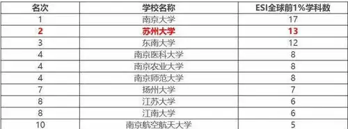 ESI排名是目前评价一所大学国际学术水平及影响的重要指标,而苏州大学在这项排名上拥有相当大的优势。截至2020年4月,苏州大学共有13个学科进入ESI全球排名前1%,其中两个学科进入前1‰,江苏省排名仅次于南京大学,可以说苏州大学这一项成绩的突出是近些年学校在很多排名中表现较好的主要原因之一。详情如下: