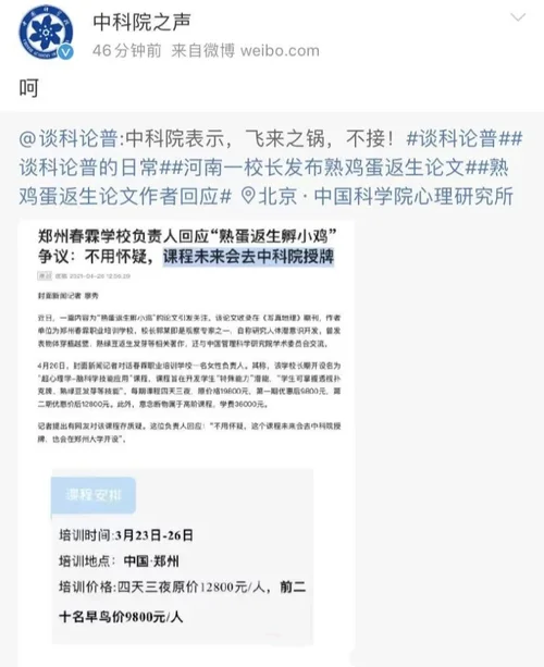 4月26日,面对外界针对春霖职业培训学校课程的质疑,学校的一名女性负责人声称:“不用怀疑,这个课程未来会去中科院授牌,也会在郑州大学开设。”