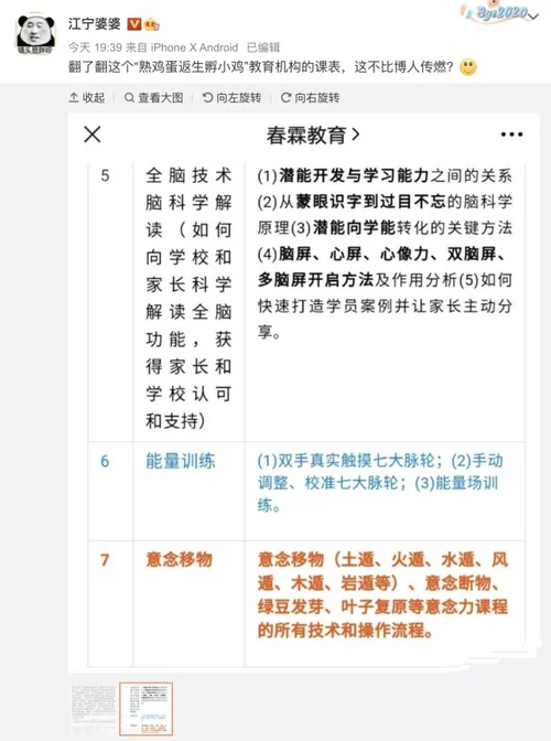 除了“四处碰瓷”外,有多个媒体发现,在该教育机构微信公众号上,有培训课程可以教授“过目不忘”、“意念移物(土遁、火遁、水遁、风遁、木遁、岩遁等)”、意念断物、绿豆发芽、叶子复原等,不少网友直呼:这不比博人传燃?
