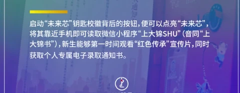 将其靠近手机即可读取微信小程序“上大锦SHU”(音同“上大锦书”),新生能够第一时间观看“红色传承”宣传片,同时获取个人专属电子录取通知书。