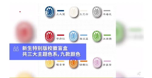 此外,还有新生特别版校徽盲盒,共三大主题色系,九款颜色。