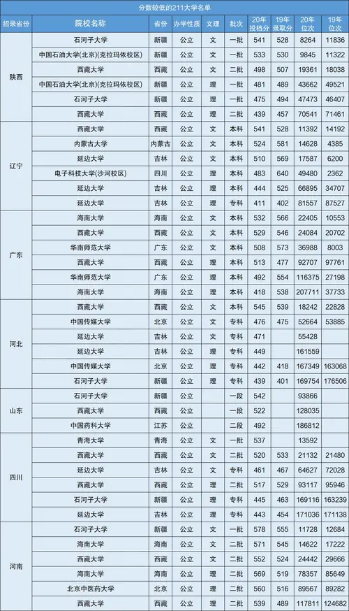 以上就是适合捡漏的211大学名单,名单中包含了211大学的所在地区和2020年以及2019年的录取分数和最低录取位次,同学们可以结合自己的实际情况进行填报。需要注意的是,有些211院校除了在一批次招生还会在二批次和专科段招生。