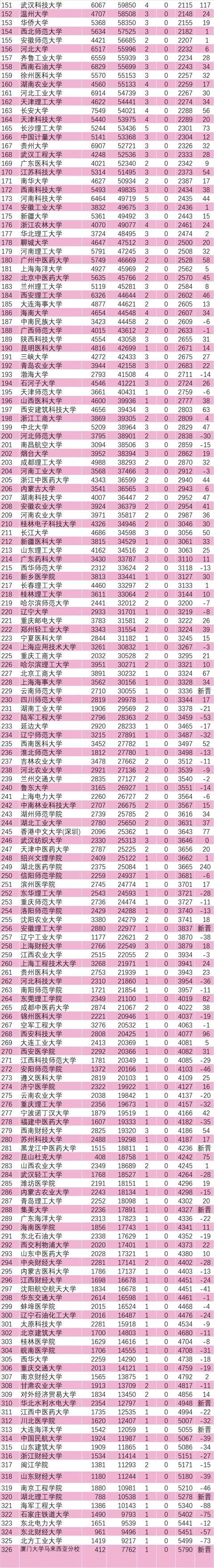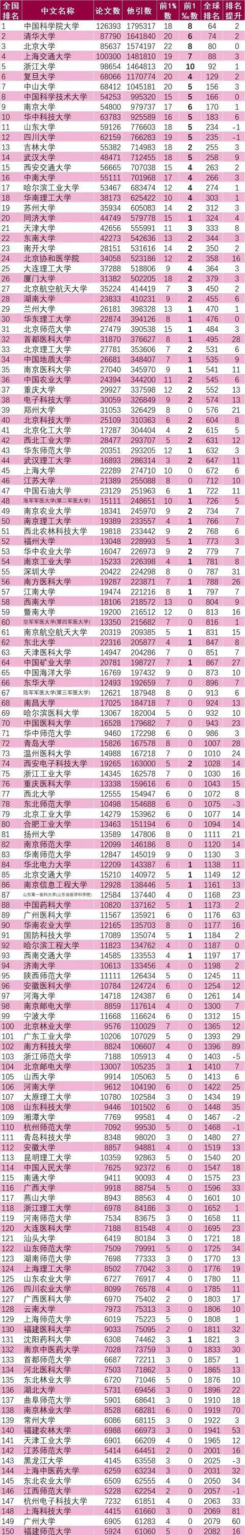 中国内地326所高校有学科进入全球前1%,新增8所,退出0所,中国科学院大学全球排名64位居第一,清华大学全球排名74居第二,北京大学全球排名80位屈居第三。新增高校为:云南师范大学、安徽理工大学、黑龙江中医药大学、集美大学、华北水利水电大学、大连海洋大学、湖北理工学院、厦门大学马来西亚分校,各高校均有1个学科入榜。