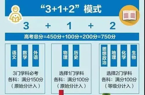 选考科目:①物理/历史使用原始成绩计入考生总成绩,每门满分100分;②思想政治/地理/化学/生物按等级赋分后计入考生总成绩,每门满分100分。