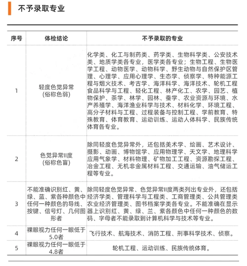 部分工科专业明确指出色盲、色弱考生不予录取,如化学类、药学类、生物类部分专业会对进档的色弱(轻度色觉异常)考生做退档处理;应用物理学、地理科学、地质类等专业对进档的色盲(色觉异常ll度)考生做退档处理。