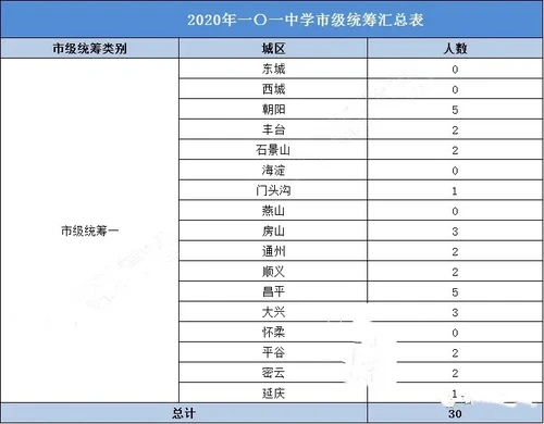 2020年一〇一中学市级统筹一对东西海3区以外的其它各区均有1-5名不等的招生计划,这些区的考生可以通过市级统筹一跨区进入一〇一中学。