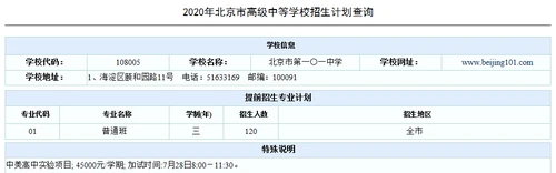 2020年一〇一中学提前招生计划共计120人,名称为中美高中实验项目,面向全市招生,其他区考生也可以通过国际班跨区升入北京一〇一中学,学费为45000元/学期。