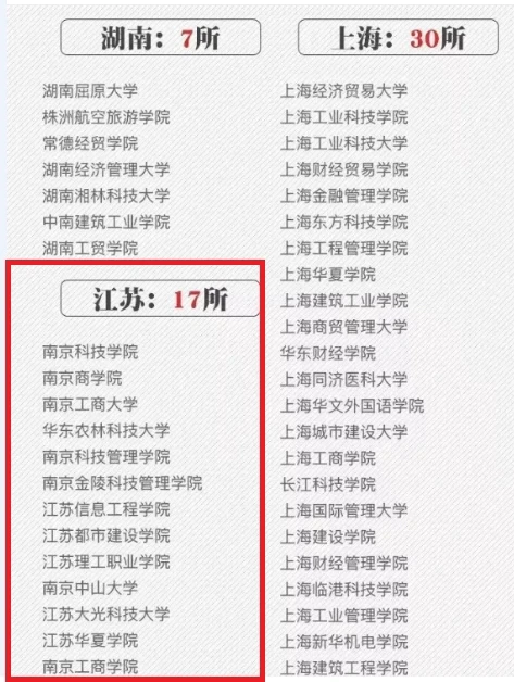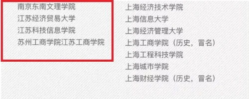 另一个是以“江苏”打头,有7所,校名也很独特,很容易被大家识别,比如说江苏大光科技大学,江苏华夏学院等,只要大家认真识别,还是能够很清楚的甄别出来;第三个类型有2所,分别是华东农林科技大学,苏州工商学院等,都是野鸡大学。