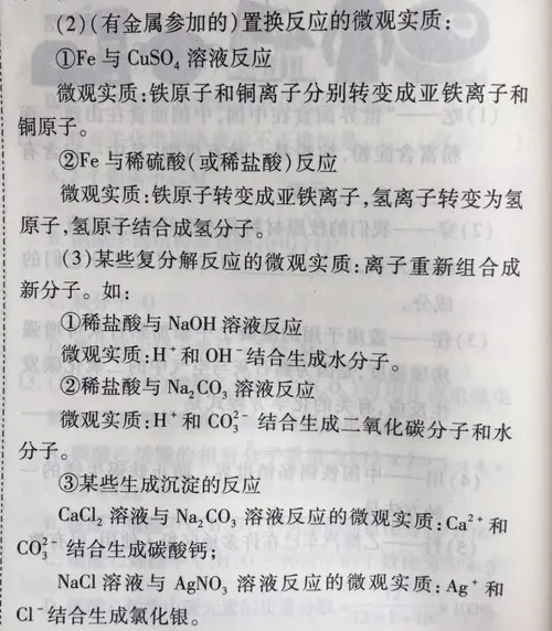 注:要区分微观实质和反应的原因不同。例如:铁和硫酸铜反应的实质是:铁原子变为亚铁离子,铜离子变为铜原子。能发生反应的原因是:在金属活动性顺序表中,铁在铜前面,且硫酸铜是可溶的。