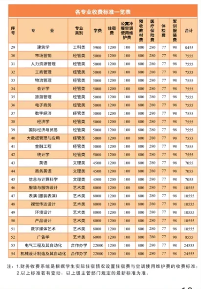 工科类专业:5900元/年;经管类专业5000元/年;文理类专业:4500元/年;艺术类6000-8000元/年;合作办学类专业:22000元/年。2、住宿费: