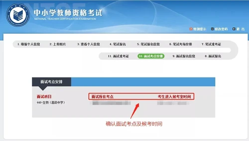 在“面试考点安排”中,确认自己的面试考点及候考信息