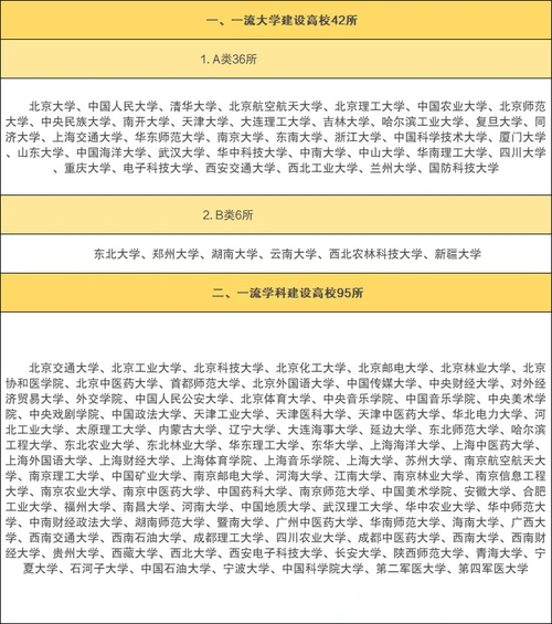 在第一轮双一流建设名单中,双一流大学建设高校一共有42所,双一流学科建设高校一共有95所,具体名单如下: