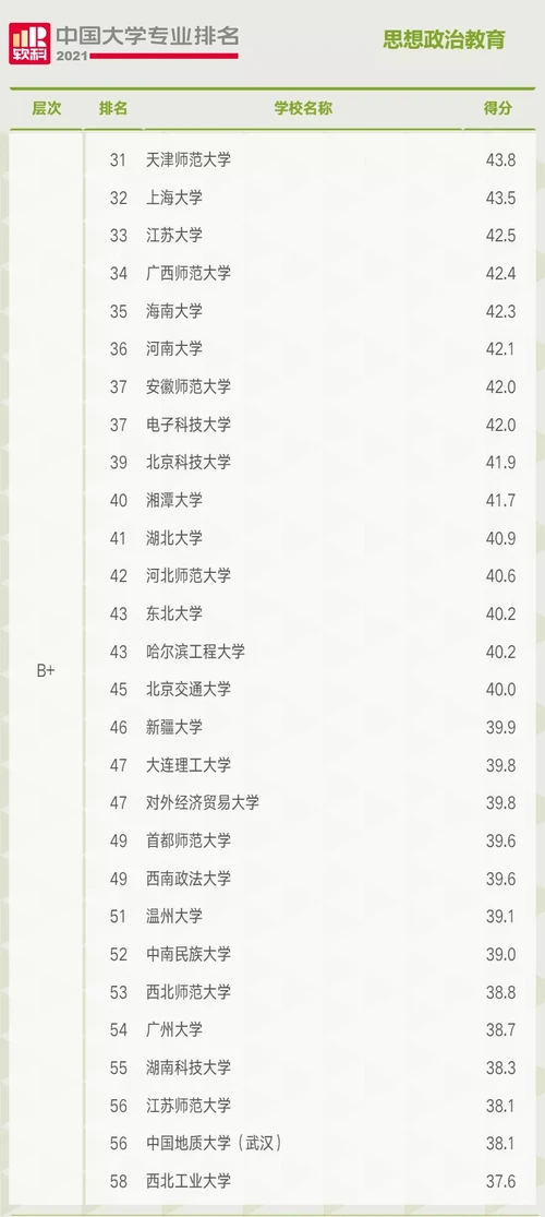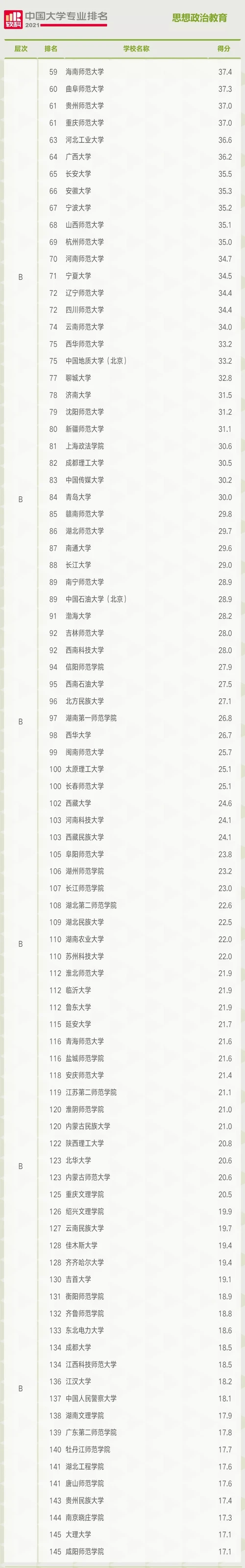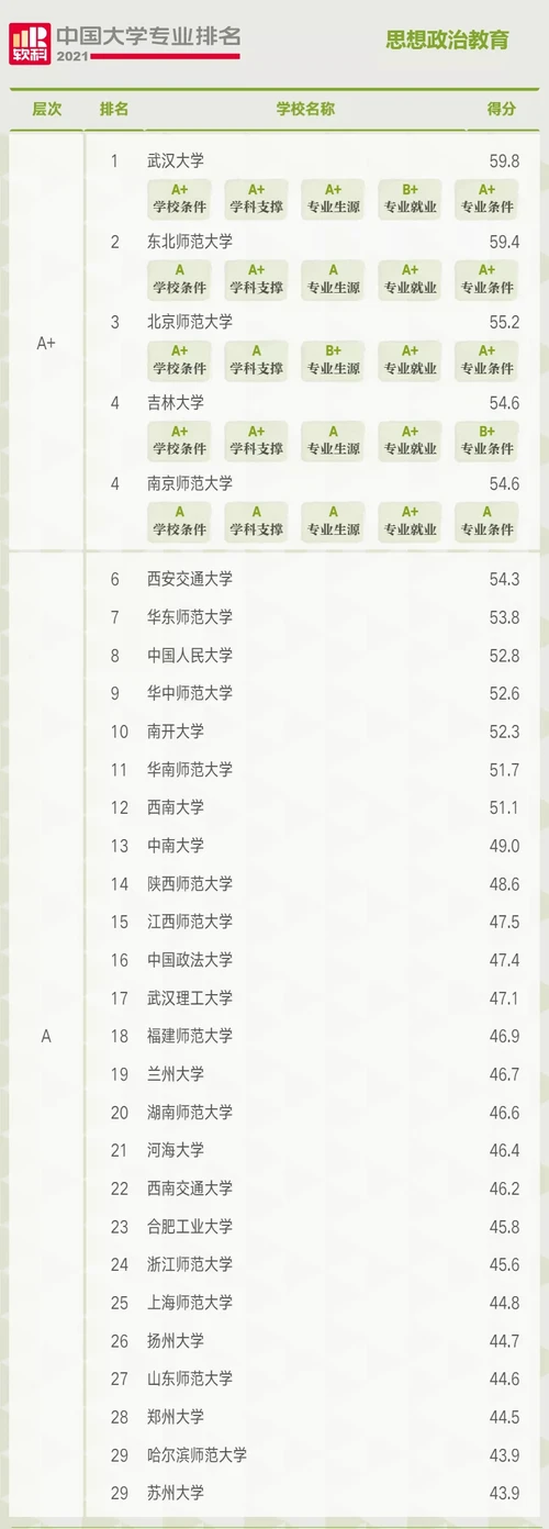 在思想政治教育专业排名中,共有146所高校上榜,A+层次的高校依次为武汉大学、东北师范大学、北京师范大学、吉林大学、南京师范大学。