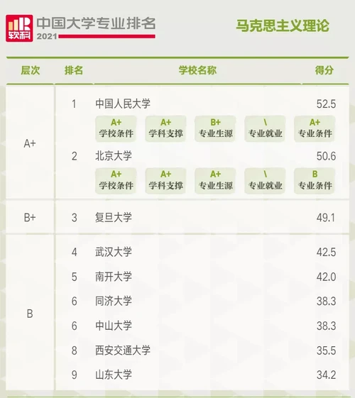 在马克思主义理论专业排名中,共有9所高校上榜,A+层次的高校依次为中国人民大学、北京大学。