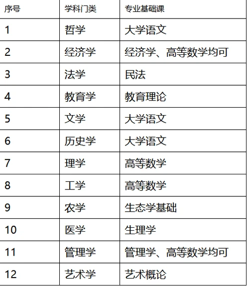 专业基础课按照教育部《普通高等学校本科专业目录》(2020年版)分设的哲学、经济学、法学、教育学、文学、历史学、理学、工学、农学、医学、管理学、艺术学12个学科门类进行设置。具体安排如下: