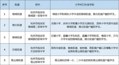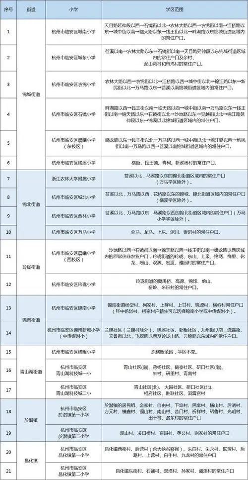 锦城、锦北、玲珑、锦南、青山湖街道和於潜镇、昌化镇小学学区
