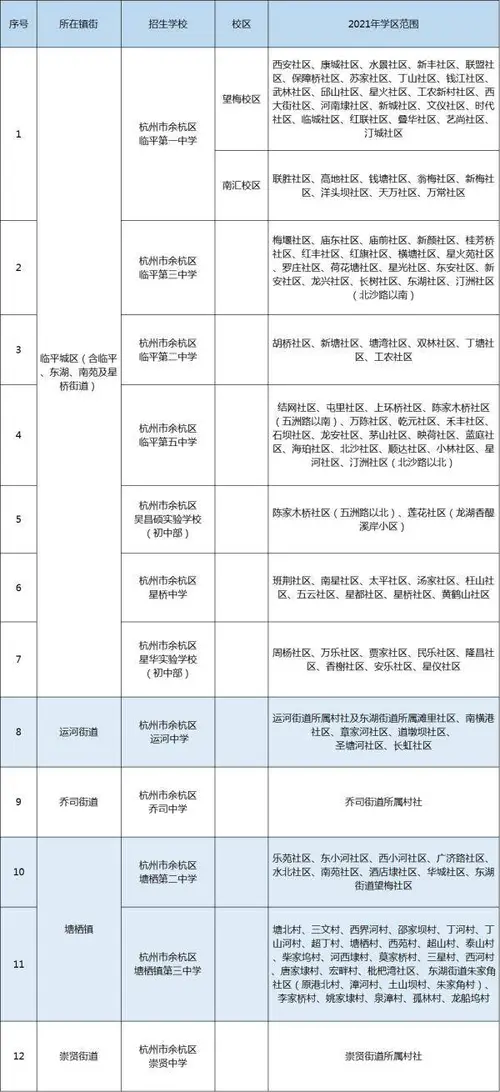 2021年临平区辖区内部分村(社区)行政区域进行调整,各义务段学校(校区)按照学区边界不变原则,对部分学校(校区)学区范围的表述进行调整。