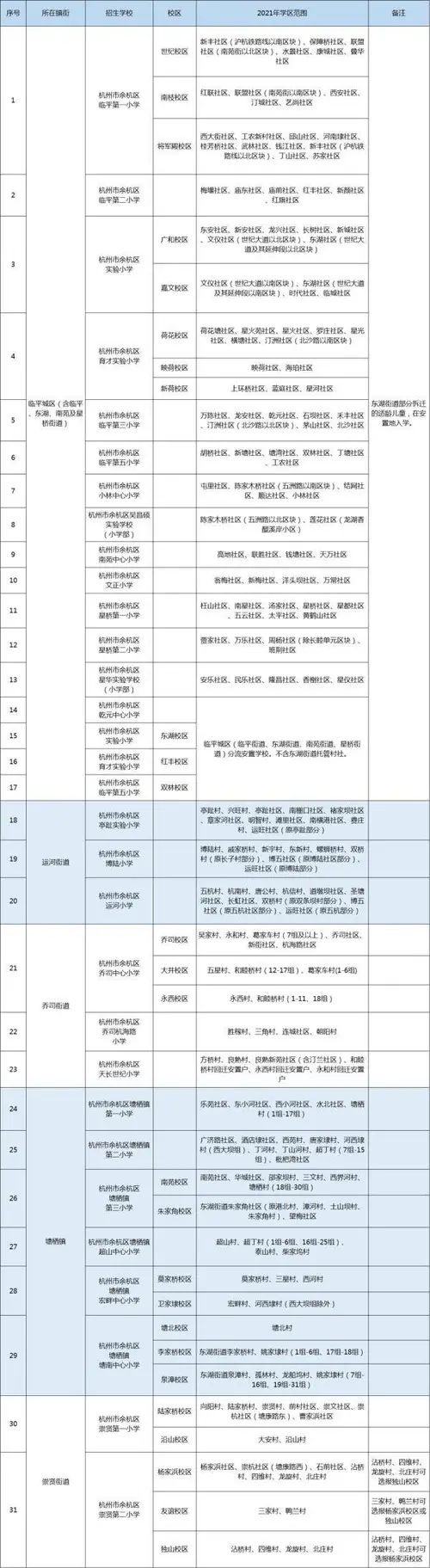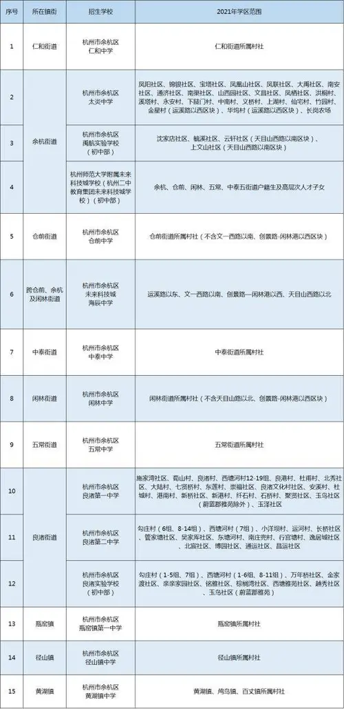 2021年余杭区辖区内部分村(社区)行政区域进行调整,各义务段学校(校区)按照学区边界不变原则,对部分学校(校区)学区范围的表述进行调整。